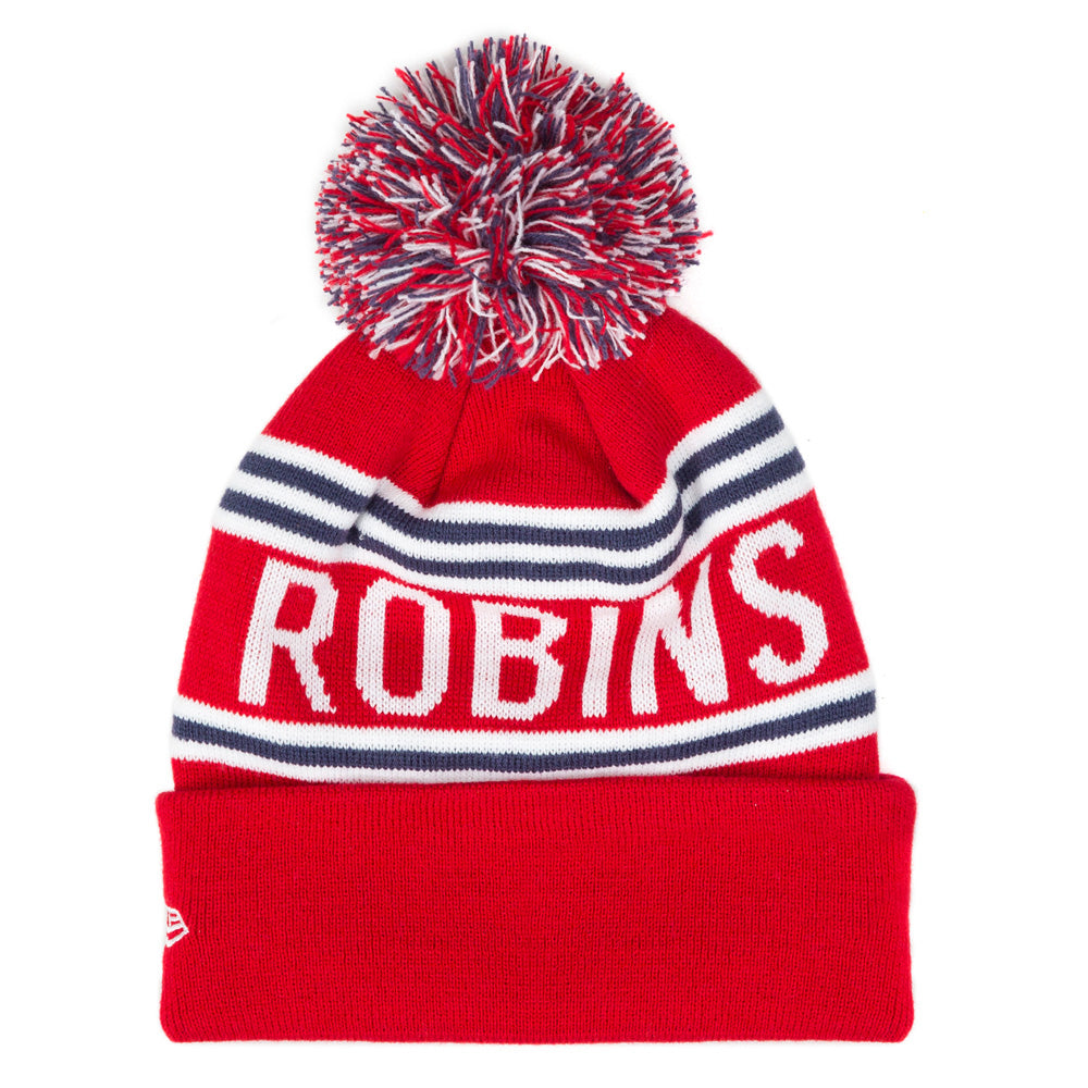 Stay warm and showcase your Hull KR pride with the New Era Red Robins Bobble Hat. This is produced by New Era and features the Hull KR embroidered crest on the front along with the word "ROBINS", allowing you to showcase your Hull KR pride.
